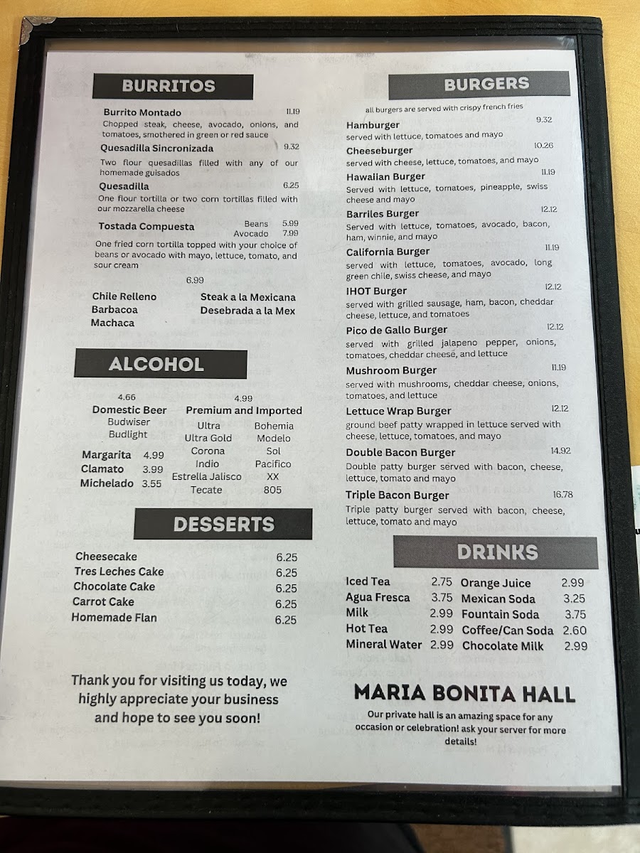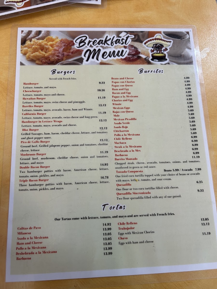 The menu is a testament to tradition, featuring a variety of enticing options, from the Big Breakfast Burritos to family-sized Super Barril packs. Indulge in the Delicious Caldo de Rez or savor the Mexican plate with chili relleno and enchiladas, complemented by fresh tortillas that truly shine.